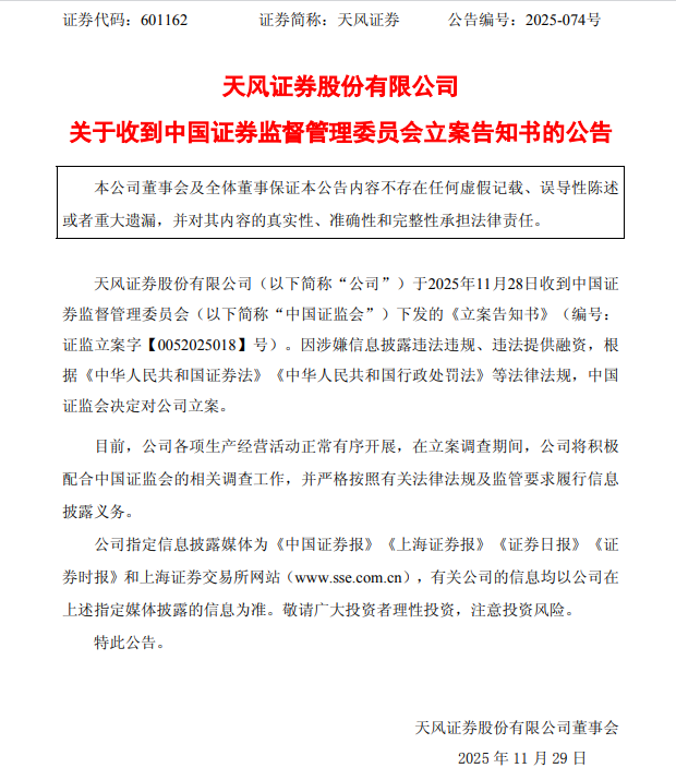 11月28日,天风证券发布公告显示,收到中国证券监督管理委员会下发的《立案告知书》(编号:证监立案字【0052025018】号)。因涉嫌信息披露违法违规、违法提供融资,根据《中华人民共和国证券法》《中华人民共和国行政处罚法》等法律法规,中国证监会决定对天风证券立案。