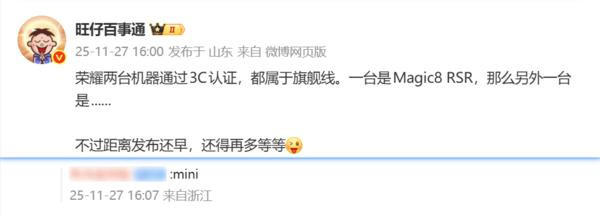 根据网间曝光的荣耀新机获3C认证的截图来看,这三款荣耀新机很可能都来自荣耀Magic8系列。而根据 @荣耀手机 Magic系列机型的发布节奏和此前曝光的信息推测,新机很可能是此前传闻中Magic8 RSR版和Magic8 mini小直屏版。根据此前曝光的信息来看,荣耀Magic8 RSR将搭载高通第五代骁龙8至尊版处理器,而荣耀Magic8 mini则将搭载联发科天玑9500处理器。