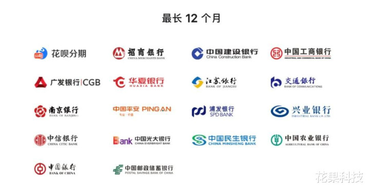 支持最长 12 个月分期免息的银行列表与 24 期一致,主要就是多了个花呗分期。
