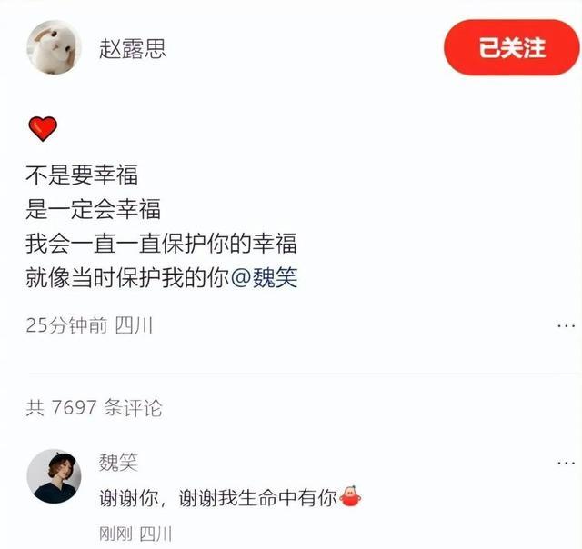 熟悉两人过往的人都知道,这份祝福背后,是双向奔赴的深情守护。2024年底,赵露思突发疾病陷入人生低谷,是魏笑第一时间放下手中的工作,日夜守在她身边,无微不至地照顾她、鼓励她,陪她度过了最艰难的时光,甚至在跨年夜,也放弃与家人团聚的机会,陪着赵露思在病房里度过。如今魏笑收获幸福,赵露思的全程陪伴与暖心祝福,正是对这份患难友情最好的回馈。